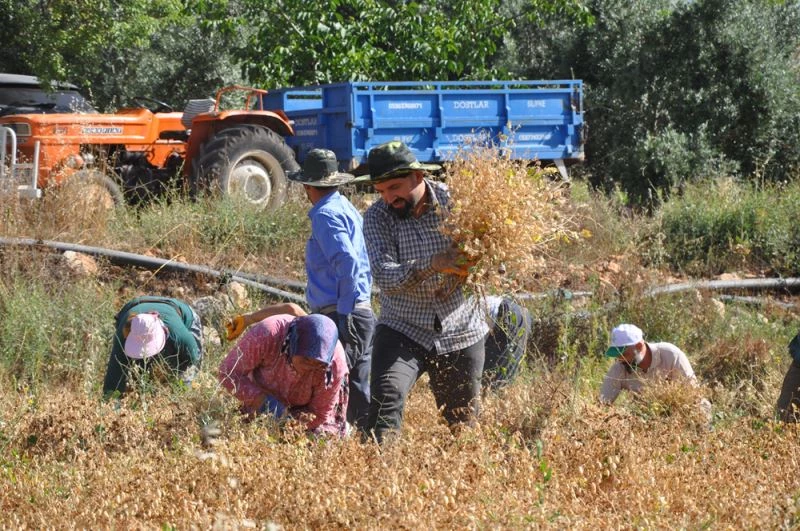 Silifke ilçesinin yüksek kesimlerdeki nohut tarlalarında da sıcağa rağmen hasat mesaisi sürüyor.