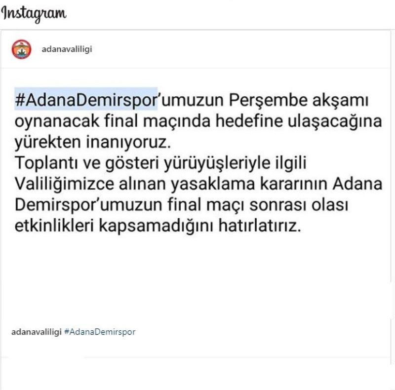 Adana Valiliği’nin resmi sosyal medya hesabından yapılan açıklamada, "Adana Demirsporumuzun perşembe akşamı oynanacak final maçında hedefine ulaşacağına yürekten inanıyoruz. Toplantı ve gösteri yürüyüşleriyle ilgili valiliğimizce alınan yasaklama kararının Adana Demirspor’umuzun final maçı sonrası olası etkinlikleri kapsamadığını hatırlatırız" denildi.