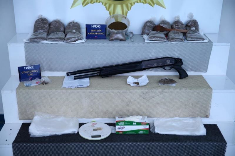 Adreste yapilan aramada, 3 kilo 795 gram sentetik kannabinoid, 7 uyusturucu hap, bir av tüfegi ve uyusturucu satisindan elde edildigi degerlendirilen 7 bin 140 lira bulundu.