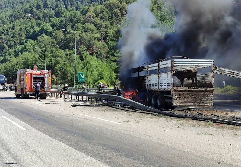 Adana-Pozantı Otoyolu Akçatekir mevkisinde seyir halindeki 63 ADE 887 plakalı büyükbaş hayvan yüklü tırda henüz belirlenemeyen nedenle yangın çıktı.