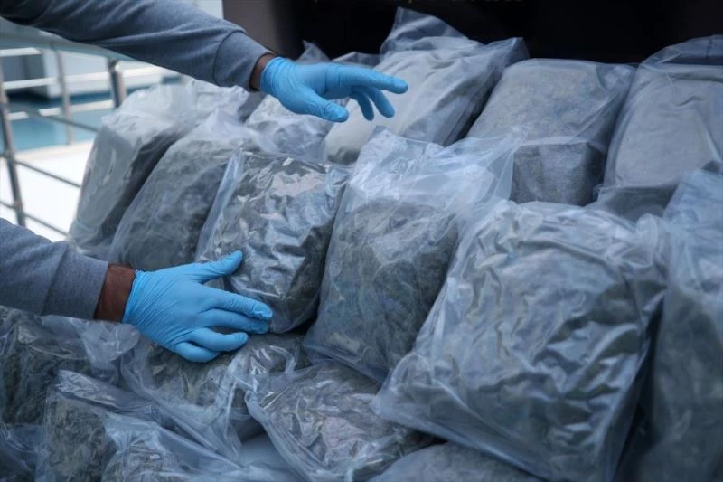 Köpeğin, araçtaki bazı eşyalara tepki vermesi üzerine yapılan detaylı incelemede, çuval ve iki çantada 53 kilo 350 gram esrar bulundu.