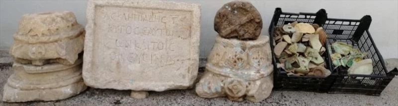 Şüphelinin adresinde yapılan aramalarda tarihi eser niteliği taşıdığı belirlenen ve Roma dönemine ait olduğu değerlendirilen mermer mezar siteli, 2 mermer sütun tabanı, mermer sütun başı, hac figürlü taş obje ve çok miktarda kırılmış halde çini işlemeli terakota ele geçirildi.