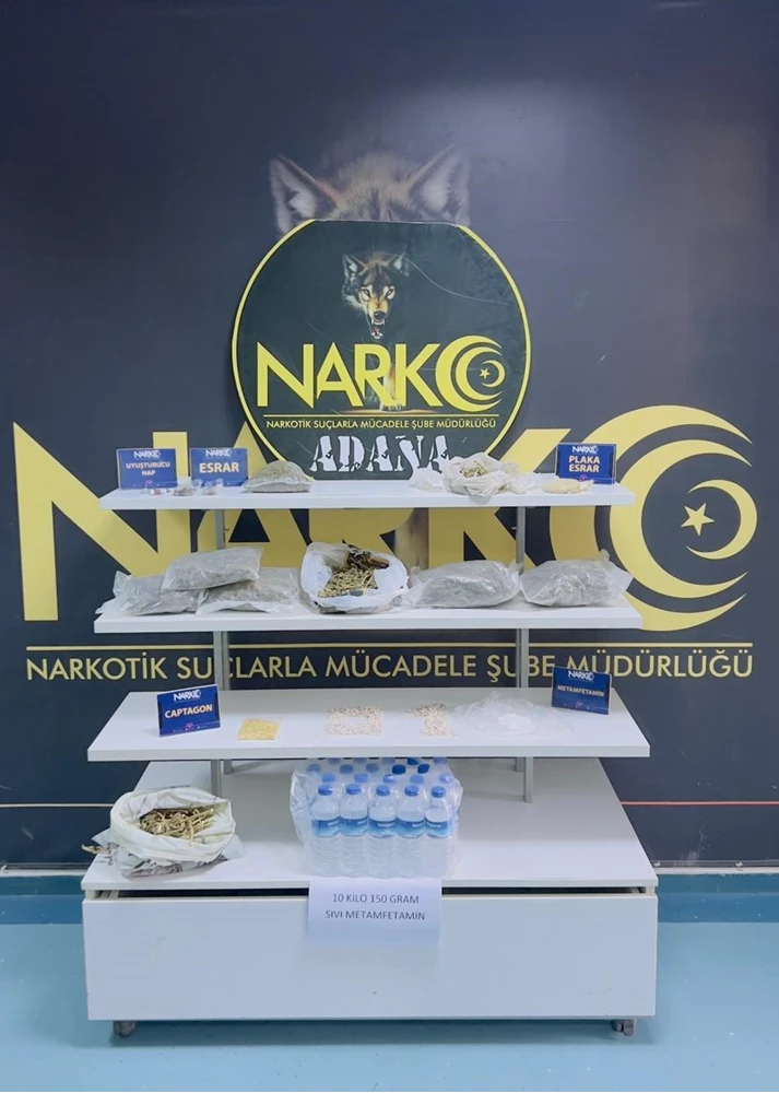 Evdeki aramalarda, 10 kilo 183 gram sıvı metamfetamin, 2 kilo 51 gram esrar, 1539 uyuşturucu hap ve kırmızı reçeteyle satılan uyuşturucu etkili 5 hap ele geçirildi.