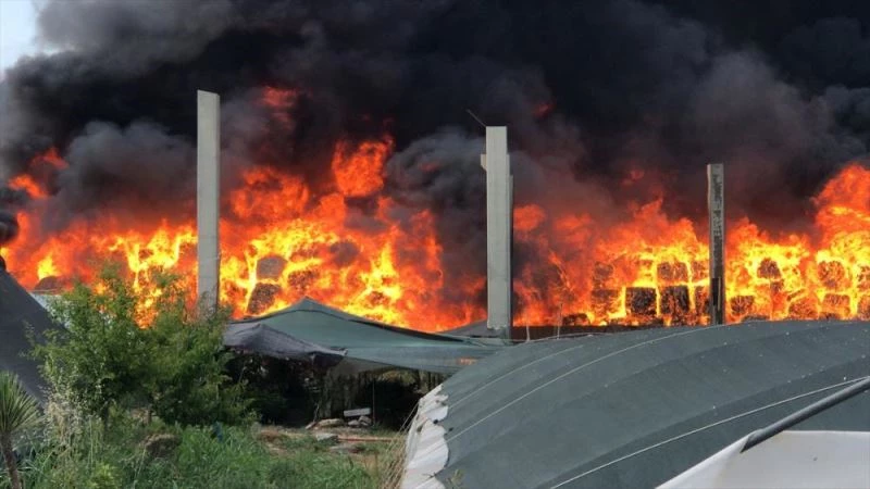 Bahçedeki plastik balyaların tutuşması üzerine büyüyen yangına, bölgeye yönlendirilen çok sayıda itfaiye ekibi müdahale ediyor.