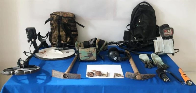 Adreslerdeki aramalarda, 2 define arama ile 2 metal dedektörü, 2 kazma, 2 boş kovan ve muhtelif sayıda taş ele geçirildi, 5 şüpheli gözaltına alındı.