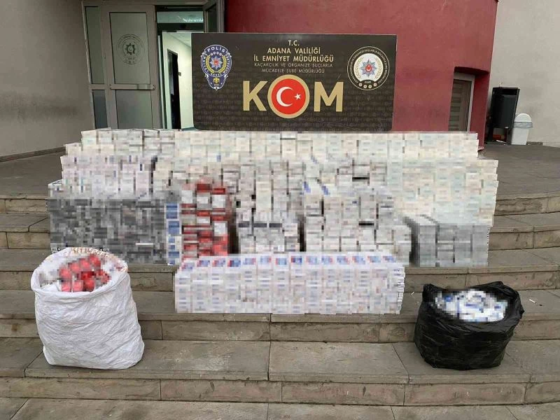Adana’da düzenlenen kaçakçılık operasyonunda 13 bin 260 paket sigara, 345 kilo nargile tütünü ve 21 cep telefonu ele geçirildi.