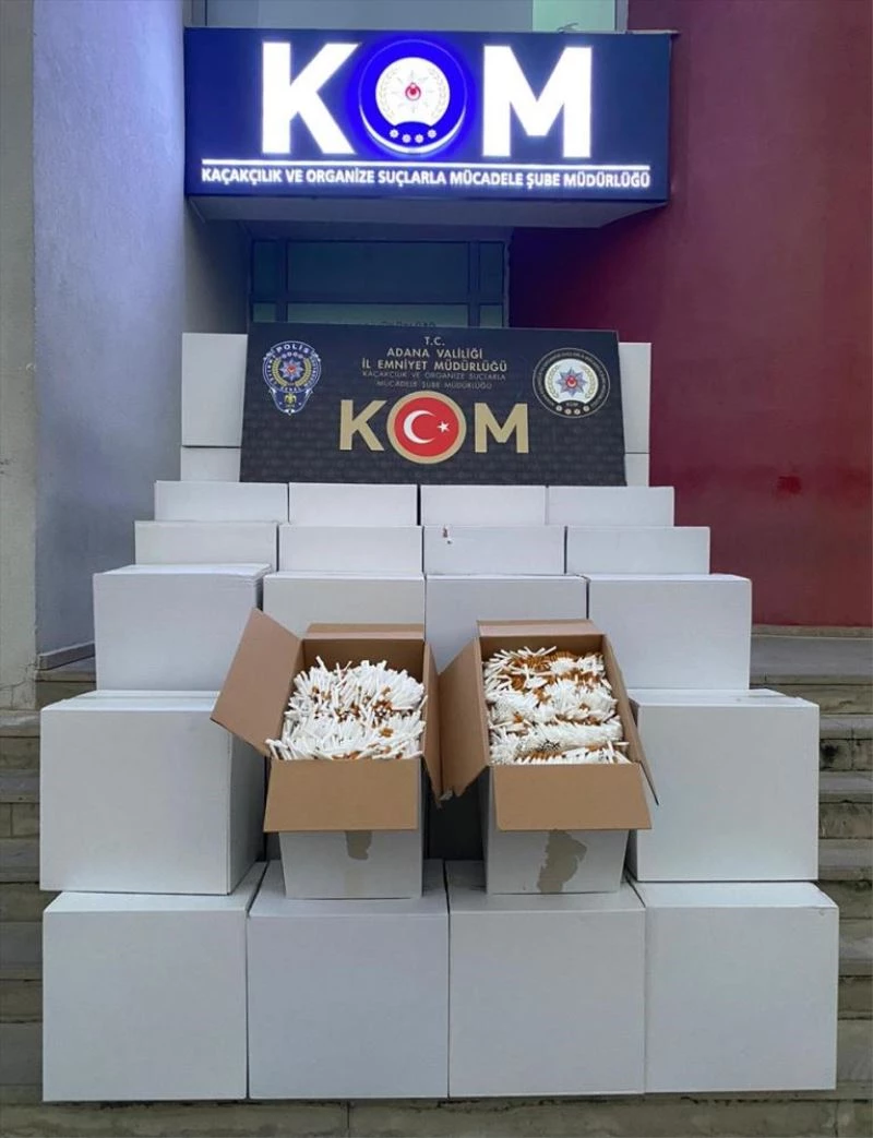 Merkez Yüregir ilçesinde park halindeki bir kamyonetin kasasindaki kolileri de inceleyen ekipler, 440 bin makaron ele geçirdi.
