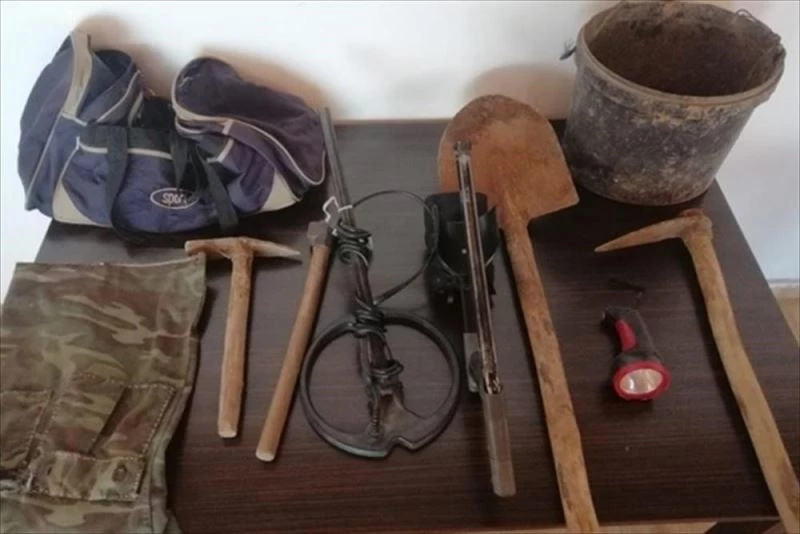 Yanlarında dedektör, kürek, keser, kova, fener ve 2 kazma bulunan zanlılar, jandarma karakoluna götürüldü.