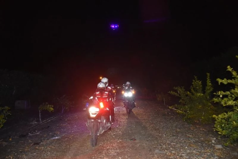 İlçe Emniyet Müdürü Ahmet Yarlıgaç'ın katıldığı uygulamada ekipler drone ile bahçeleri kontrol etti.