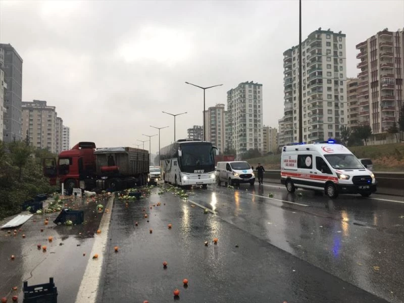 Kazaya karışan kamyonetlerden birinin kasasında bulunan meyve ve sebzeler de yola savruldu.
