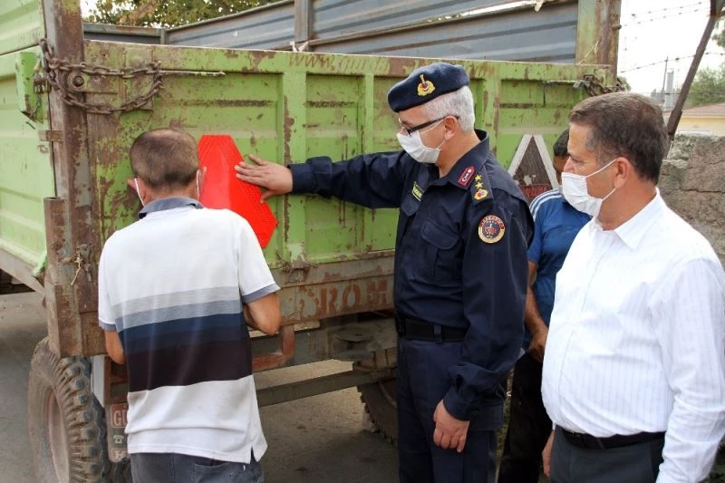 Yüreğir Ziraat Odası ve Jandarma Komutanlığı iş birliğiyle trafik kazalarının önüne geçmek amacıyla başlatılan "Reflektör Tak, Görünür Ol" projesi kapsamında, traktör sahibi çiftçilerin römorklarına iki adet reflektör takıldı.