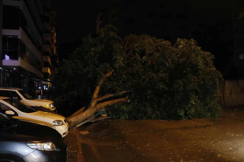 Adana’da gece saatlerinde etkili olan sağanak yağış ve şiddetli rüzgar nedeniyle 7 metrelik ağaç caddeye devrildi.