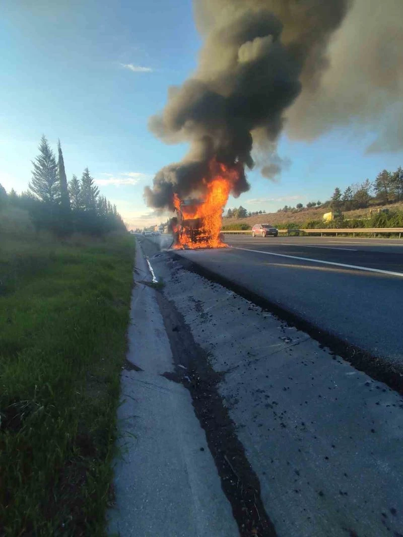 Adana’da otoyolda ilerleyen tır alev topuna dönüştü. Yangından yaralanan olmazken, itfaiye ekipleri yanan aracı söndürdü.