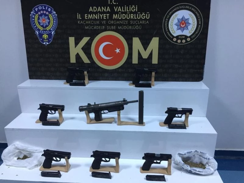 Adana’da silah kaçakçılarına yönelik operasyonda 20 zanlı gözaltına alınırken, 1 otomatik tabanca, 16 ruhsatsız tabanca, 4 kuru sıkı tabanca, 436 gram esrar ve çok sayıda mermi ele geçirildi.