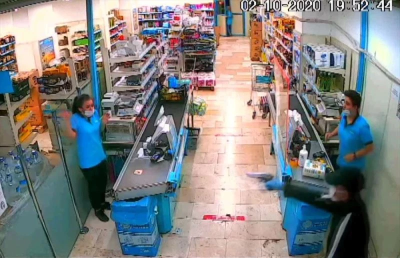 Zanlinin silahla tehdit ettigi çalisandan kasayi açmasini istemesi ve bu sirada müsterilerin panikle marketin arka bölümüne kosusturmasinin da yansidigi görüntüde, süphelinin tehditle kasayi açtirip paralari alarak uzaklasmasi görülüyor.