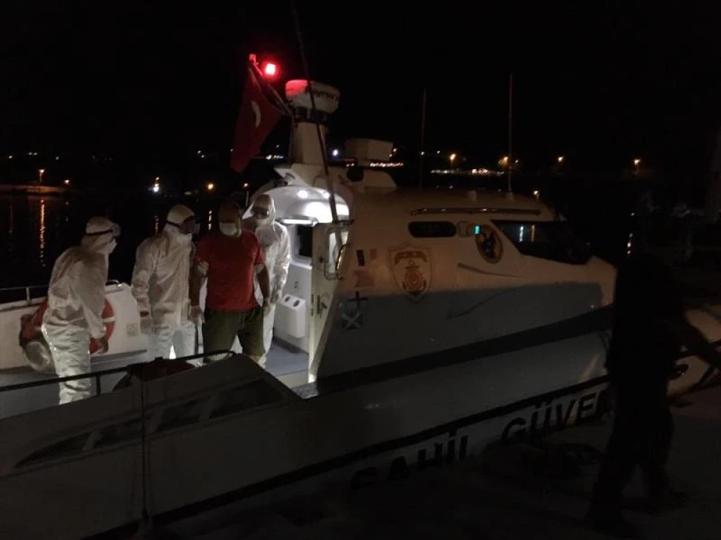 Pandemi nedeniyle özel kiyafet giyen ekipler, saglik görevlileriyle birlikte Karatas Limani'ndan botla ayrilarak teknenin bulundugu yere gitti.