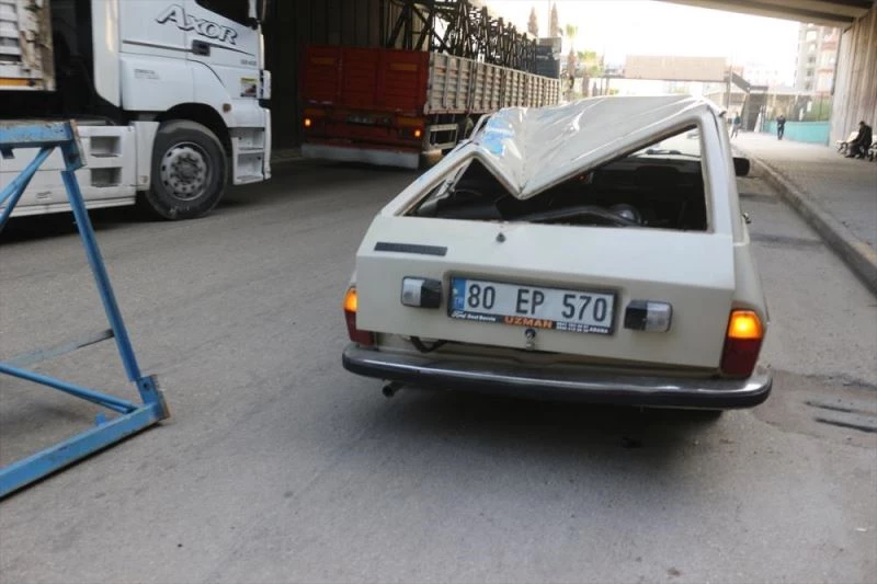 ADANA - Adana'da tır dorsesinde yüklü elektrik direğinin üzerine düştüğü otomobilin sürücüsü yaralandı.