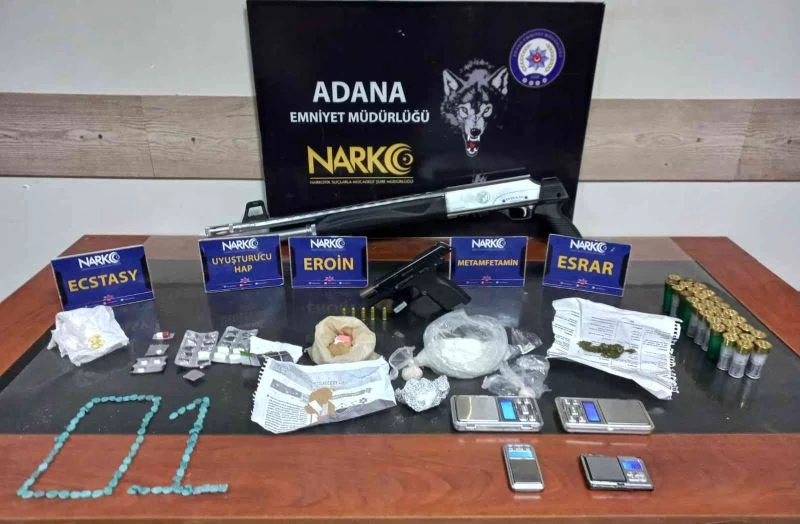 Adana Emniyet Müdürlüğü Narkotik Suçlarla Mücadele Şube Müdürlüğü ekipleri, Yüreğir ve Seyhan ilçesindeki iki evde uyuşturucu madde satışı yapıldığı bilgisine ulaştı. Ekipler, şüpheli Ö.K.’nin Havutlu Mahallesi, V.Ş.’nin ise Namık Kemal Mahallesi’ndeki evlerine operasyon düzenledi. Ö.K. ile V.Ş. gözaltına alınırken, adreslerde yapılan aramalarda 128 metamfetamin, 45 gram eroin, 97 uyuşturucu hap, 5 gram esrar, 4 hassas terazi, ruhsatsız tabanca ve pompalı tüfek ele geçirildi.