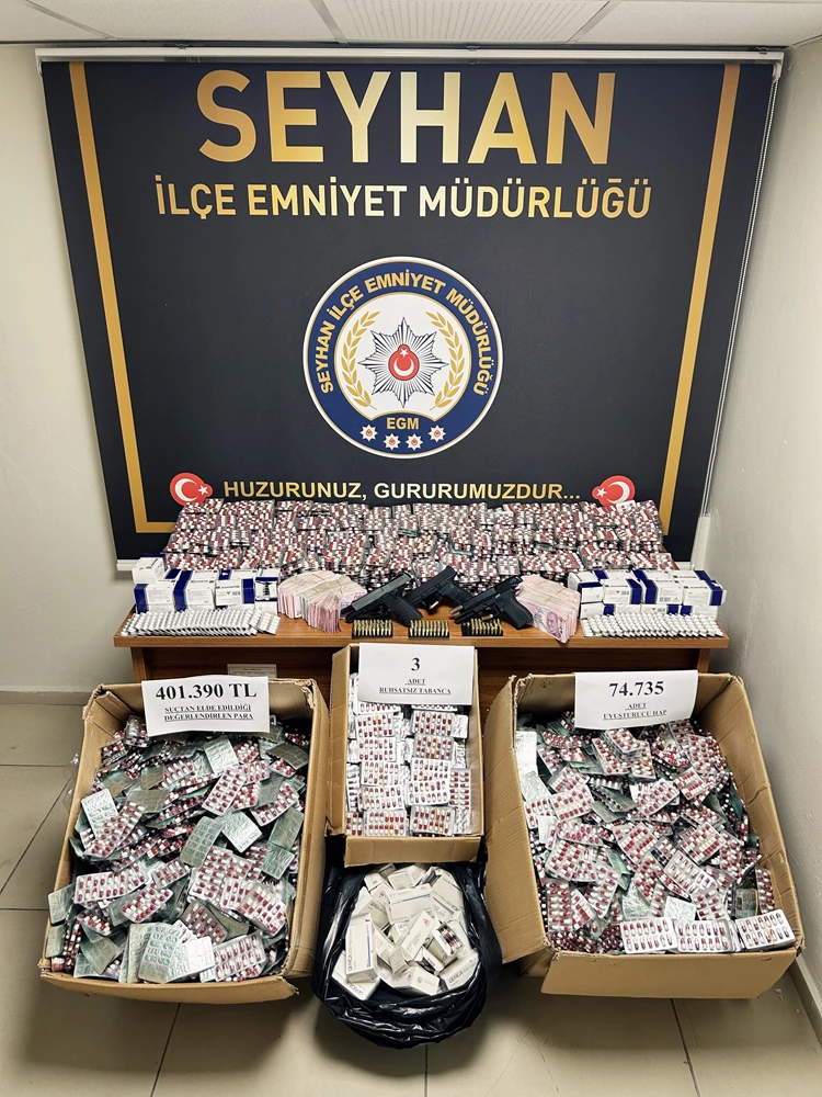 İş yerinde ve bir araçta yapılan aramada, ruhsatsız 3 tabanca, 74 bin 697 sentetik ecza, 38 uyuşturucu hap, 6,33 gram esrar, 15,16 gram eroin, hassas terazi ve uyuşturucu satışından elde edildiği değerlendirilen 401 bin 390 lira ele geçirildi.