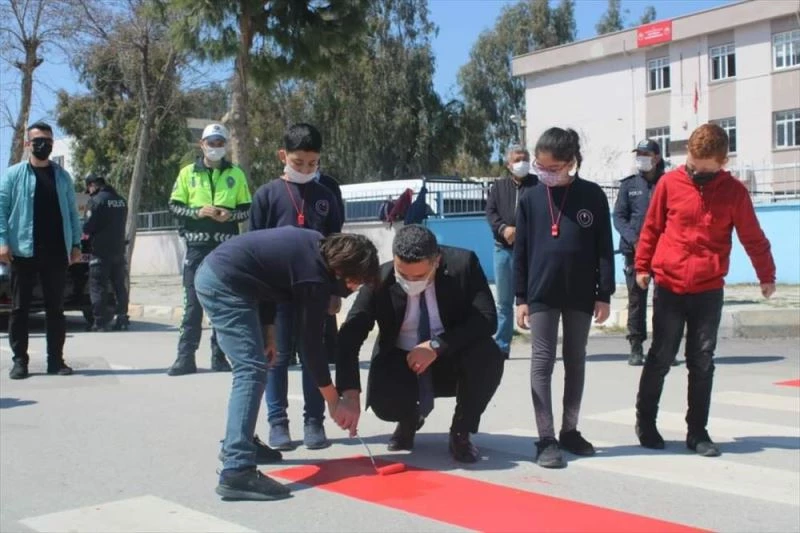 Kaymakamı Fatih Ayaz, Belediye Başkanı Necip Topuz, resmi kurum müdürleri ve öğrenciler, Karataş Anaokulunun önünde yaya geçidinde kırmızı şerit boyadı.