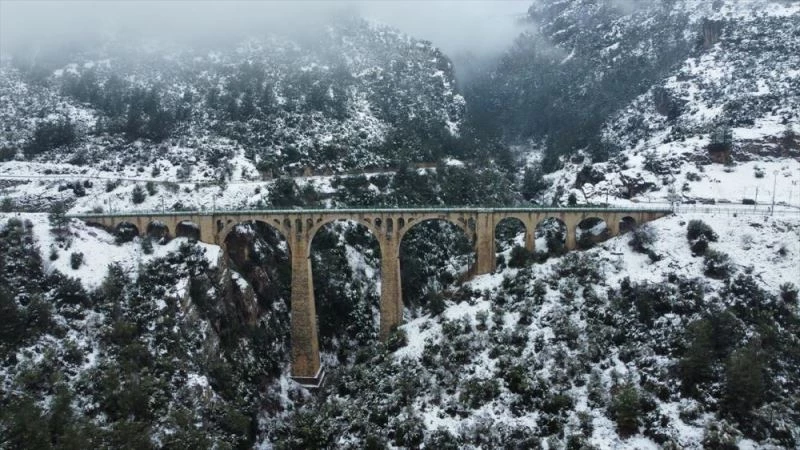 ADANA - Adana'nın Karaisalı ilçesindeki, üzerinden demir yolu da geçen 110 yıllık Varda Köprüsü kar yağışında beyaz örtüyle kaplandı.