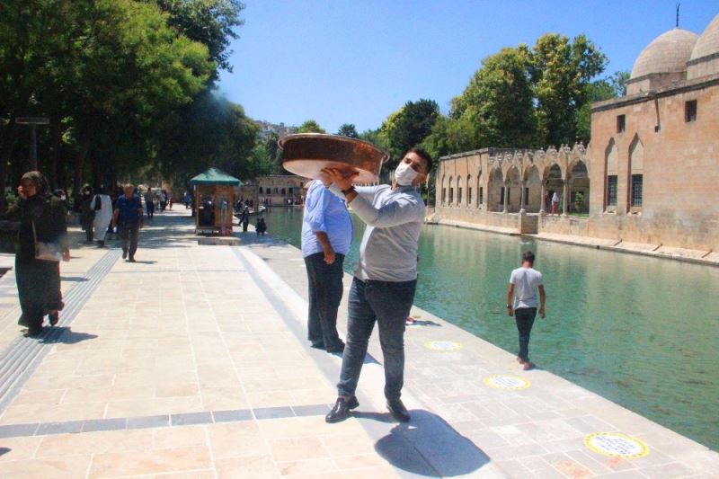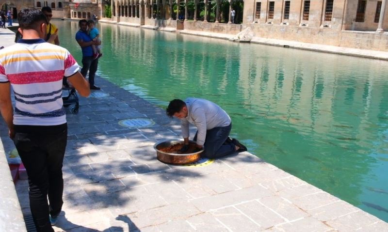 Adana’dan Şanlıurfa’ya gelen bir vatandaş, leğenini alıp Balıklıgöl’de çiğköfte yoğurdu. Vatandaşların şaşkın bakışları arasında çiğköfte yoğuran şahıs, ziyarete gelen turistlere ikram etti. Çiğköftenin tadına bakan turistler, hatıra fotoğrafı çektirdi.