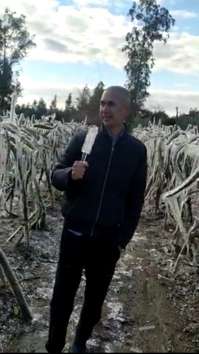 Adana’nın Kozan ilçesinde ejder meyvesi üretimi yapan Mustafa Akçoban, sabah bahçesindeki ağaçlarda oluşan buz sarkıtlarını görünce büyük şaşkınlık yaşadı. Adana gibi sıcak bir bölgede buz sarkıtları oluşmasının inanılmaz bir durum olduğunu dile getiren Akçoban, sarkıtlardan birini eline alıp mikrofon gibi kullanarak haber sunumu yaptı.