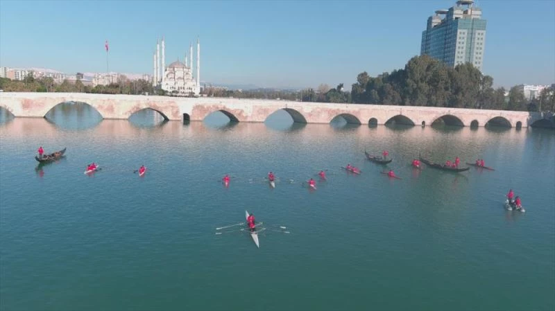 ADANA - Adana'nın düşman işgalinden kurtuluşunun 100. yıl dönümü dolayısıyla lise öğrencileri, kano sporcularının eşliğinde tarihi Taşköprü üzerinde koreografi sergiledi.