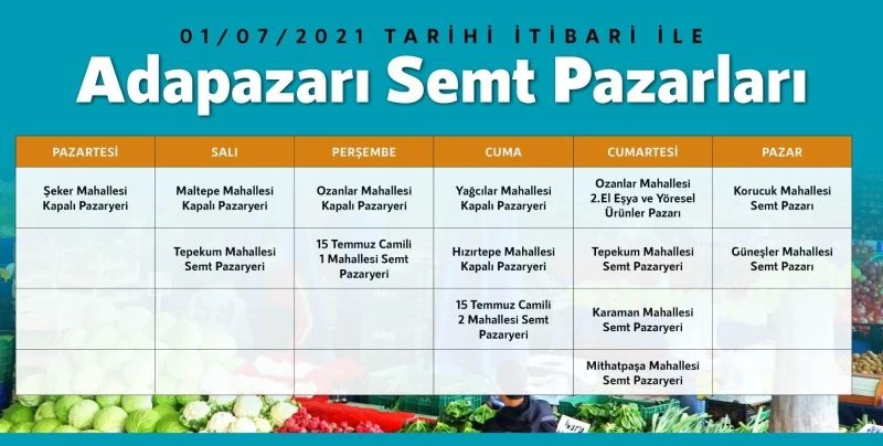 Bu doğrultuda 1 Temmuz tarihinden sonra hizmet verecek olan pazar yerleri şu şekilde: Pazartesi: Şeker Mahallesi Kapalı Pazar Yeri, Salı: Maltepe Mahallesi Kapalı Pazar Yeri. Perşembe: Ozanlar Mahallesi Kapalı Pazar Yeri, 15 Temmuz Camili 1 Mahallesi Semt Pazar Yeri Cuma: Yağcılar Mahallesi Kapalı Pazar Yeri, Hızırtepe Mahallesi Kapalı Pazar Yeri, 15 Temmuz Camili 2 Mahallesi Semt Pazar Yeri. Cumartesi: Tepekum Mahallesi Semt Pazar Yeri, Ozanlar Mahallesi 2. El Eşya ve Köy Ürünleri Pazarı, Karaman Mahallesi Semt Pazar Yeri, Mithatpaşa Mahallesi Semt Pazar Yeri, Pazar: Korucuk Mahallesi Semt Pazarı ve Güneşler Mahallesi Semt Pazarı.
