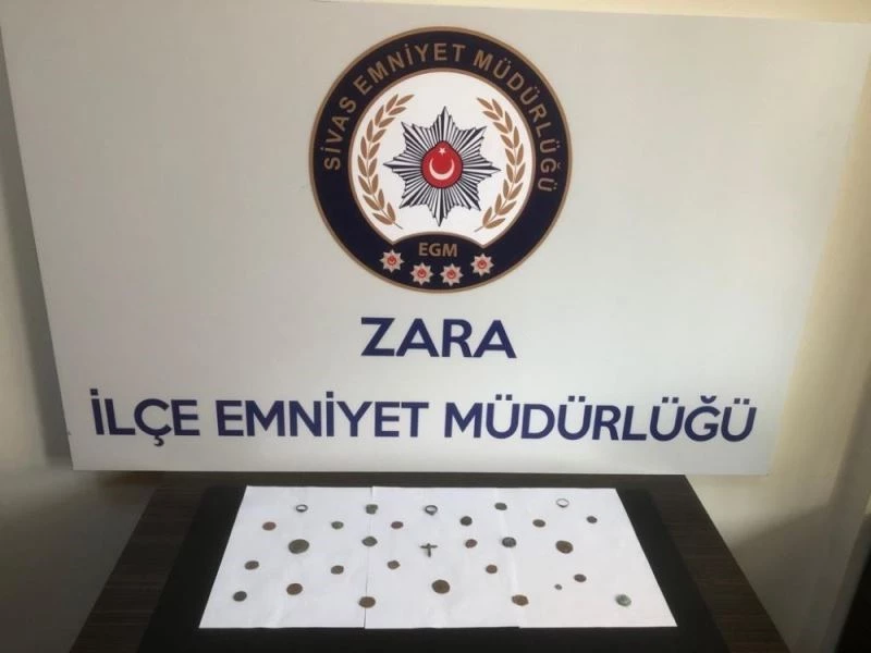 Sivas’ın Zara ilçesinde 9 Mart tarihinde İlçe Emniyet Müdürlüğü ekiplerince yapılan denetimler sırasında bir şahıs durdurularak üzeri arandı. Şahsın üzerinde tarihi eser olabileceği değerlendirilen 1 adet haç, 3 adet yüzük, 25 adet çeşitli ebatlarda sikke ele geçirildi. Ele geçirilen tarihi eserler Sivas Müze Müdürlüğü’nce gerekli incelemenin yapılabilmesi için muhafaza altına alındı. Yakalanan şüpheli hakkında yasal işlem başlatıldı.