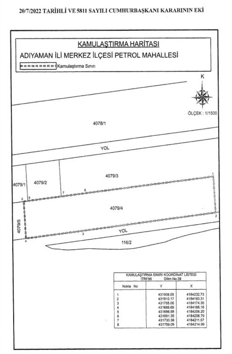 Petrol Mahallesinde bulunan 116/2, 4079/1, 4079/2, 4079/3, 4078/1 ada ve parsellerin kamulaştırılması için karar yayımlandı.