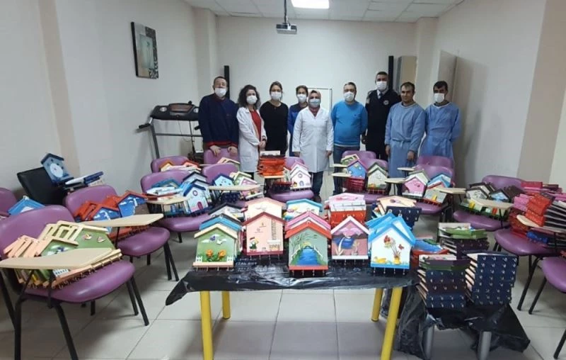 Psikiyatri uzmanı Dr. Sema Sağlam öncülüğünde TRSM çalışanları ve gönüllü öğretmenler birlikte 20 günlük bir çalışma süresi sonucunda tamamen el işçiliği ile yapılan 400 adet ahşap anahtarlık panoları dağıtıma hazır hale getirdi.