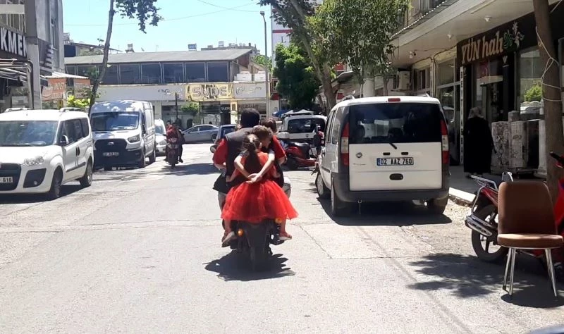 Adıyaman merkez Cumhuriyet Caddesi üzerinde ilerleyen elektrikli bisikletin üzerindeki manzarayı görenler gözlerine inanamadı. Sürücünün dışında diğerlerinin 7 ila 12 yaş arasında olduğu tahmin edilen çocuklar birbirlerine sımsıkı sarılarak yolculuk yaptı. Bu tehlikeli yolculukta sürücü, çocuklardan 2’sini önüne, 2’sini arkasına alarak ilerledi.