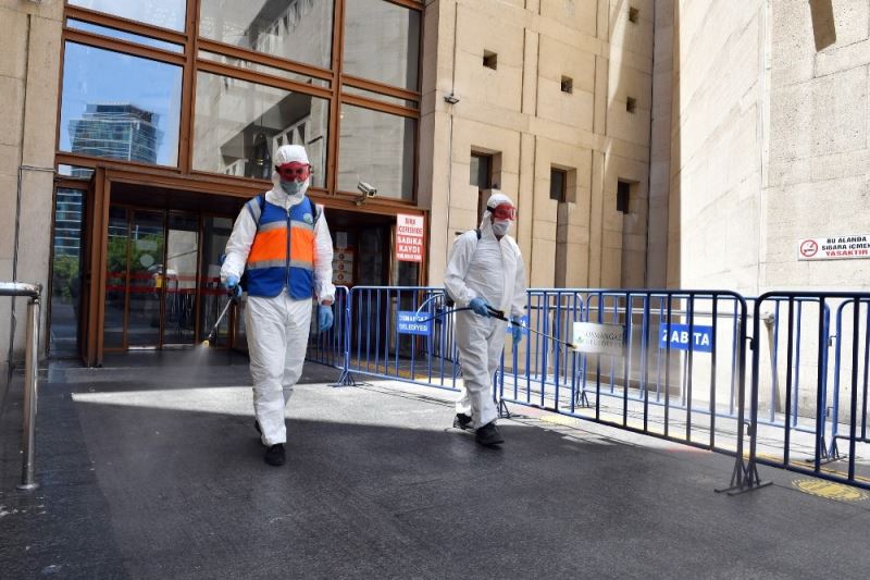 Korona virüs salgınının yayılmasını önlemek için ilçenin dört bir yanını dezenfekte eden Osmangazi Belediyesi, Adliye Sarayı ve hukuk bürolarının bulunduğu iş merkezlerinde de dezenfeksiyon çalışması yaptı.
