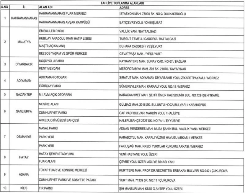 AFAD’tan yapılan açıklamaya göre, Kahramanmaraş merkezli depremlerden etkilenen vatandaşların barınma ihtiyacı sebebiyle il dışına gitmek isteyenler için jandarma birimlerince bulundukları illerde tahliye alanları oluşturuldu. Oluşturulan bu noktalara tahliye talebiyle başvuran vatandaşların tahliyesi yetkililerce belirlenecek olan en uygun vasıtalarla sağlanacak. Tahliyesi sağlanan vatandaşlar, gidecekleri illerdeki valilikler ve AFAD koordinasyonunda belirlenen barınma alanlarına ve misafirhanelere yerleştirilecek. Tahliye talepleri, illerin barınma kapasitesine göre planlanıyor. Kendi imkanlarıyla ulaşım sağlayıp afet bölgesinden ayrılmak isteyen vatandaşlar, çıkış yapmadan önce bulundukları yerlerdeki jandarma tahliye noktalarına bildirim yapmaları halinde gidecekleri illerdeki barınma noktalarına yönlendirmeler yapılacak. Oluşturulan tahliye noktaları ise şöyle: