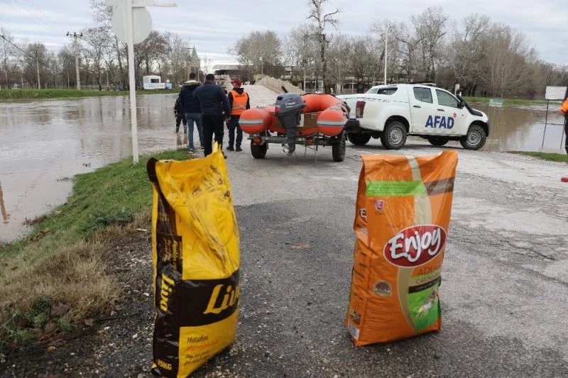 Edirne’de Tunca Nehri’nin taşması ile bazı bölgelerde mahsur kalan sokak hayvanları unutulmadı. Ekipler, bot yardımıyla ulaştıkları köpekleri mama ile besledi.