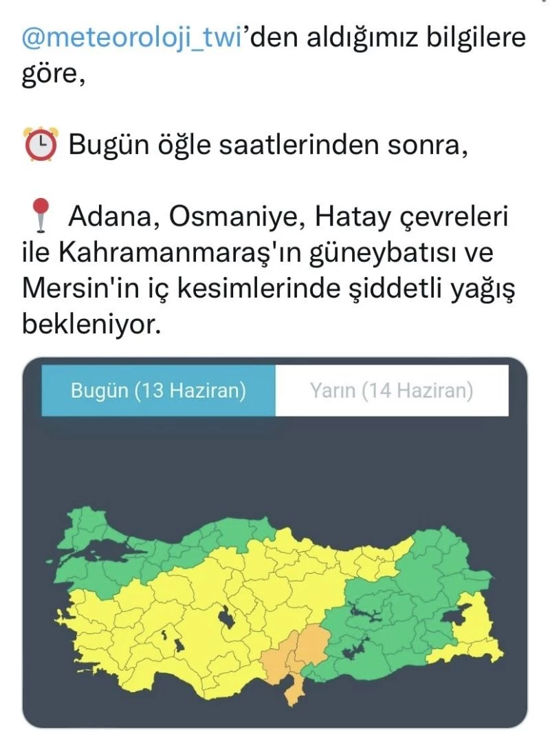 AFAD tarafından yapılan paylaşımda ülke genelinde yaşanabilecek yağışlara karşı uyarıda bulunuldu. Açıklamada: "Bugün öğle saatlerinden sonra, Adana, Osmaniye, Hatay çevreleri ile Kahramanmaraş’ın güneybatısı ve Mersin’in iç kesimlerinde şiddetli yağış bekleniyor" ifadelerine yer verildi.