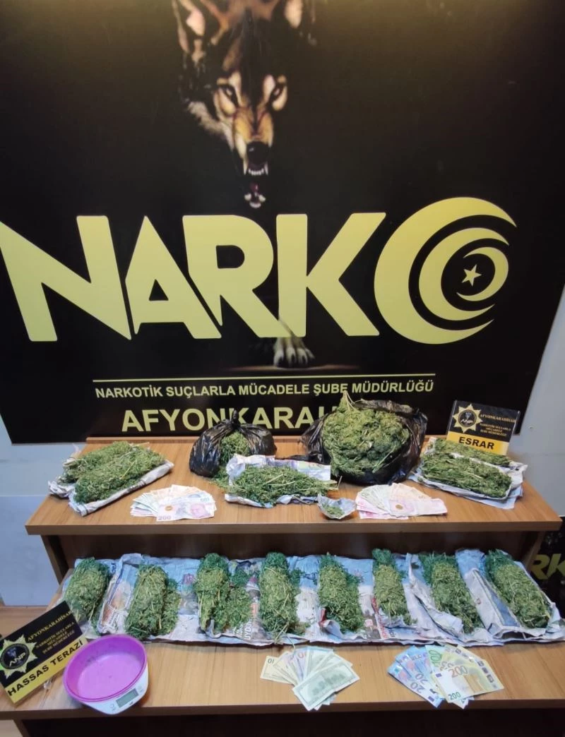 Afyonkarahisar İl Emniyet müdürlüğü Narkotik Suçlarla Mücadele Şubesi ekipleri, kentte uyuşturucu madde satışı yapıldığı bilgisi üzerine çalışma başlattı. Polis ekipleri, Cumhuriyet Mahallesi ve Fakıpaşa Mahallesi’nde belirlediği iki adrese operasyon düzenledi. Operasyonda 2 kilo 946 gram esrar, hassas terazi ile uyuşturucu satışından elde edildiği değerlendirilen bir miktar döviz, 2 altın ve 2 bin 605 lira ele geçirildi.