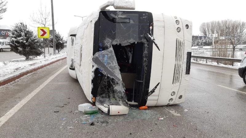Öte yandan servis otobüsünün devrilmesi sırasında yolda seyir halinde bulunan hafif ticari araç ile otomobilin de bariyerlere çarpması sonucu maddi hasar oluştu.