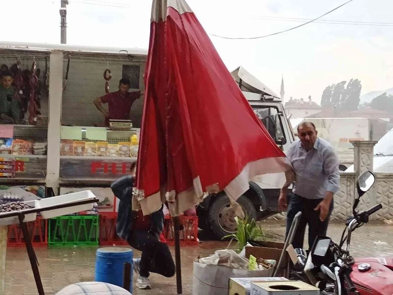 Afyonkarahisar’da aniden başlayan sağanak yağış ve rüzgar hayatı olumsuz etkilerken, Şuhut ilçesinde kurulan semt pazarında rüzgar çadırları devirirken yağmur da bir çok tezgahtaki ürüne zarar verdi.