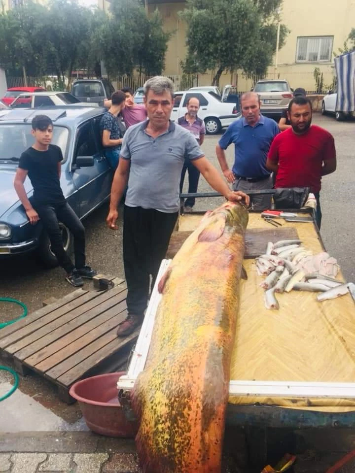Osmaniye`de uzun yıllardır balıkçılık yapan Ali Dağlı, Aslantaş Baraj gölünde ağ ile 2 metre 50 santim uzunluğunda 110 kilo ağırlığında Yayın balığı yakaladı. Tezgahta satışa sunulan dev balık, görenleri hayrete düşürdü. Düziçi ilçesinde balıkçılık yaparak geçimini sağlayan Ali Dağlı önceki gün gece Aslantaş Baraj gölüne ağ bıraktı. Sabahın erken saatlerinde göl kenarına giden Dağlı, ağlara takılan dev yayın balığını yoğun uğraş sonucu kıyıya çıkarttı. İlçe merkezindeki balıkçı tezgahında dev yayın balığını satışa sunan Dağlı, balıkçılık konusunda iddialı olduğunu söyleyerek, her yıl böyle büyük balık yakaladığını ve hemşerilerine sattığını söyledi. Devasa büyüklükteki balığı görenler ise cep telefonları ile bol bol fotoğraf çektirdiler.