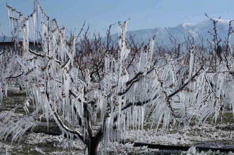 Mart ayının son günü hava sıcaklığının mevsim normalleri altına düşmesi ve gece yaşanan don olayından meyve ağaçlarını korumak isteyen meyve üreticileri ağaçları buz tutturarak dondan korumaya çalıştı. Özellikle şeftali ağaçlarının dalları ve çiçeklerine yağmurlama ve mini spring sistemi ile gece boyu su veren çiftçiler çiçekleri korumaya hedefliyor. Buz ağacına dönen şeftali ağaçlarını görenler şaşkınlıklarını gizleyemezken, yoldan geçen bazı sürücülerde gördükleri bu manzarayı fotoğraflamayı ihmal etmiyor.