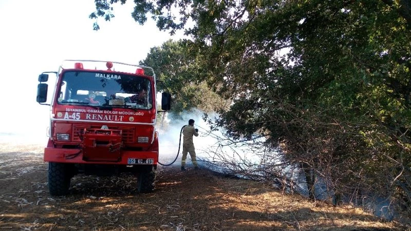 Tekirdağ’ın Malkara ilçesinde tutuşturulan ayçiçeği saplarından sıçrayan kıvılcım ağaçlık alanı küle çevirdi.