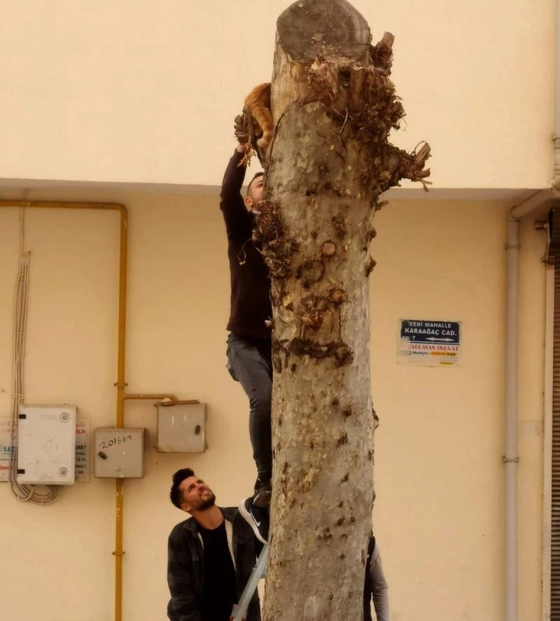 Adıyaman’ın Gölbaşı ilçesinde ağaçta mahsur kalan kediyi esnaf kurtardı.