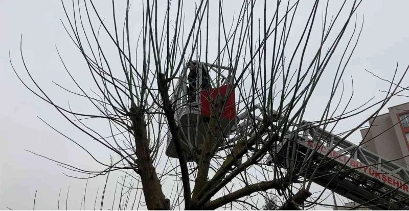Ağaçta mahsur kalan kediyi itfaiye ekipleri kurtardı