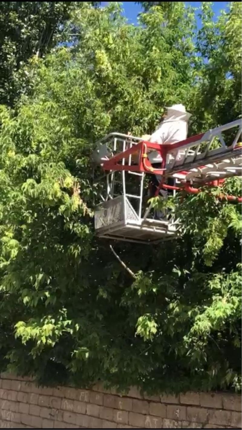 Ağrı’da kovandan kaçan ve mahalle arasında bir ağaçta oğul yapmaya başlayan arılar, itfaiye ekipleri tarafından ağaçtan indirildi.