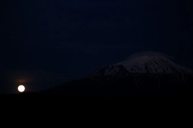 Iğdır’da muhteşem manzarası ile doğal bir tabloyu andıran Ağrı Dağı hemen yanında belirlenen ’Süper Ay’ ile kartpostallık görüntüler oluşturdu.