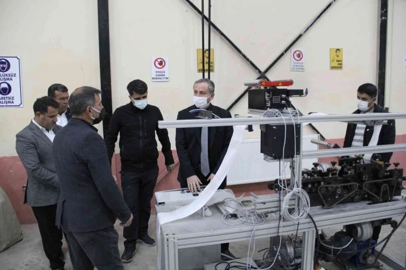Ağrı Nurettin Dolgun Mesleki ve Teknik Anadolu Lisesini ziyaret eden Ağrı İl Milli Eğitim Müdürü Hasan Kökrek, öğretmen ve öğrenciler tarafından atölyelerde İl merkezindeki okulların güvenliğini sağlamak amacıyla üretilen demir korkuluk, "Kütüphanesi olmayan okul kalmasın" projesi kapsamında il genelindeki tüm okullara kurulmak üzere hazırlanan kütüphanelerin rafları ve kent genelindeki vatandaşların, öğretmen ve öğrencilerin ihtiyaçlarını karşılamak amacıyla bir günde 200 bin maske üretmeyi hedefleyen cihaz kurulumlarını inceledi.