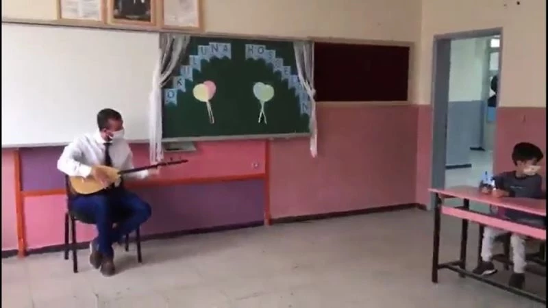 Ağrı’nın merkeze bağlı Yavuz Selim İlkokulu öğretmenleri, yüz yüze eğitimin ilk gününde öğrencileri saz eşliğinde karşıladı.