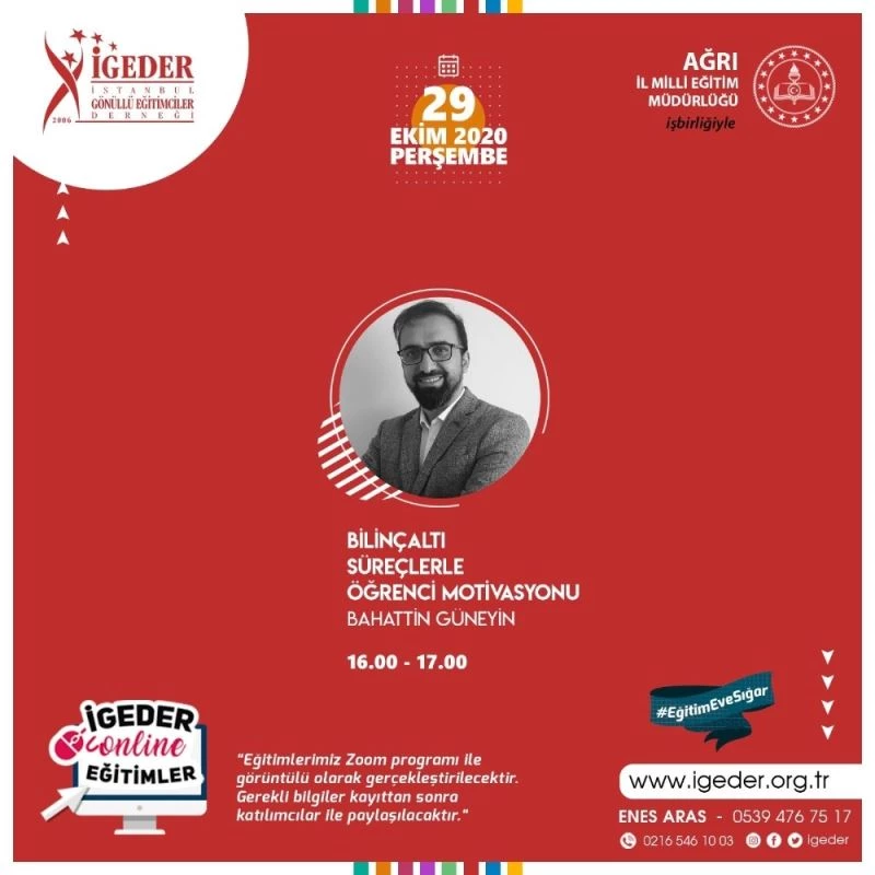 Ağrı İl Milli Eğitim Müdürlüğü ve İstanbul Gönüllü Eğitimciler Derneği (İGEDER) işbirliğiyle il genelinde görev yapan öğretmenlere yönelik e-konferans yoluyla farklı konularda eğitim programları düzenleniyor.